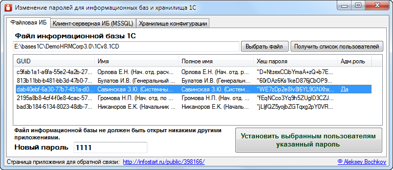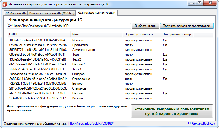 При утере паролей административных учеток к базам 1С есть разные варианты их восстановления. Если с клиент-серверными базами все просто, то с файловыми базами и хранилищем уже приходится использовать более сложные методы вплоть до ручного изменения определенных байтов в файлах. Данное приложение на .NET, позволяет забыть об этих проблемах и менять пароли пользователей в пару кликов для файловых, клиент-серверных баз 1С, а также хранилища конфигураций.